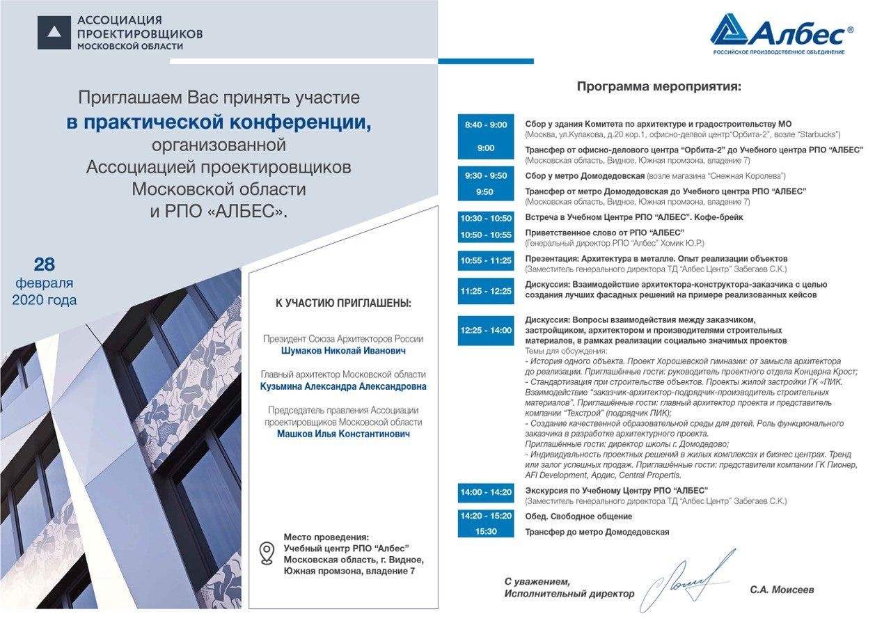 28 февраля Ассоциация проектировщиков Московской области и РПО «АЛБЕС» при поддержке Союза архитекторов России проводят практическую конференцию «Архитектура в металле», посвященную современным фасадным решениям.