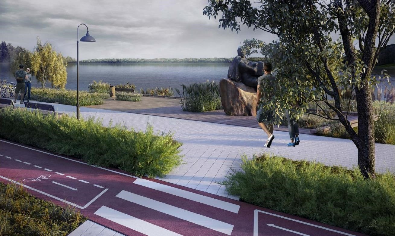 Велодорожка, дублирующая мощеный променад, будет состоять из плоских и волнистых сегментов – «волн», чередующихся друг с другом. На всем протяжении благоустраиваемого участка предполагается установить индивидуально разработанные уличные фонари, скамейки, урны, разбить цветники из многолетних растений.