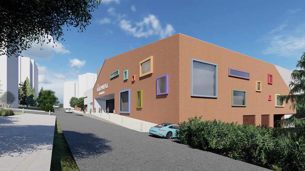 Для облицовки здания будут использованы светлые композитные панели и панели, имитирующие кирпич. Цветные обрамления окон и их разномасштабный ритм напомнят о детских функциях внутри здания.