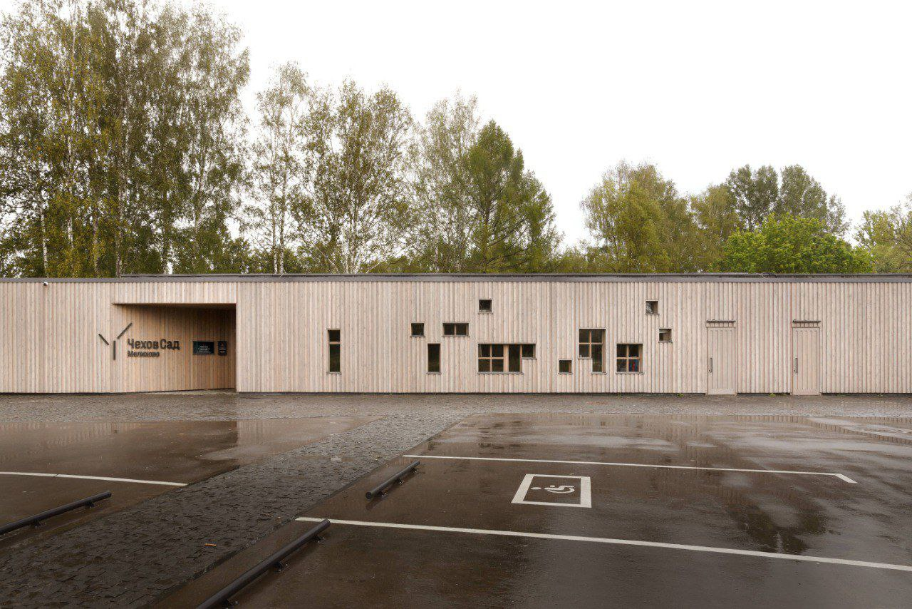 Визит-центр музея-заповедника Мелихово отсылает к образу дачи с ее традиционной верандой. Длинный внешний фасад из доски лиственницы, расположенной внахлест, с небольшими оконными проемами, концептуально продолжает деревянный забор. Зал представляет собой треугольное помещение, две стороны которого состоят из деревянного витража. Мелкая расстекловка соотносится с членением окон главного дома усадьбы, в котором жил Чехов. Хаотичное расположение глухих, зашитых деревом, створок и вставок из цветных стекла добавляет разнообразия фасаду. Вокруг здания выполнен деревянный настил, вдоль которого расположены металлические фигуры зверей и насекомых, выполненных по рисункам Чехова.