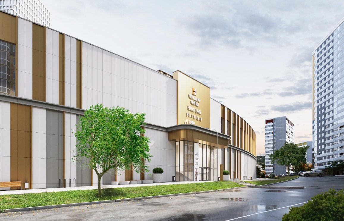 Проектные решения фасадов построены на контрасте цветов и фактур отделочных материалов. Доминирующая бежево-золотистая цветовая гамма соответствуют окружающей застройке, благодаря чему ТРЦ гармонично вписан в сложившуюся градостроительную композицию.