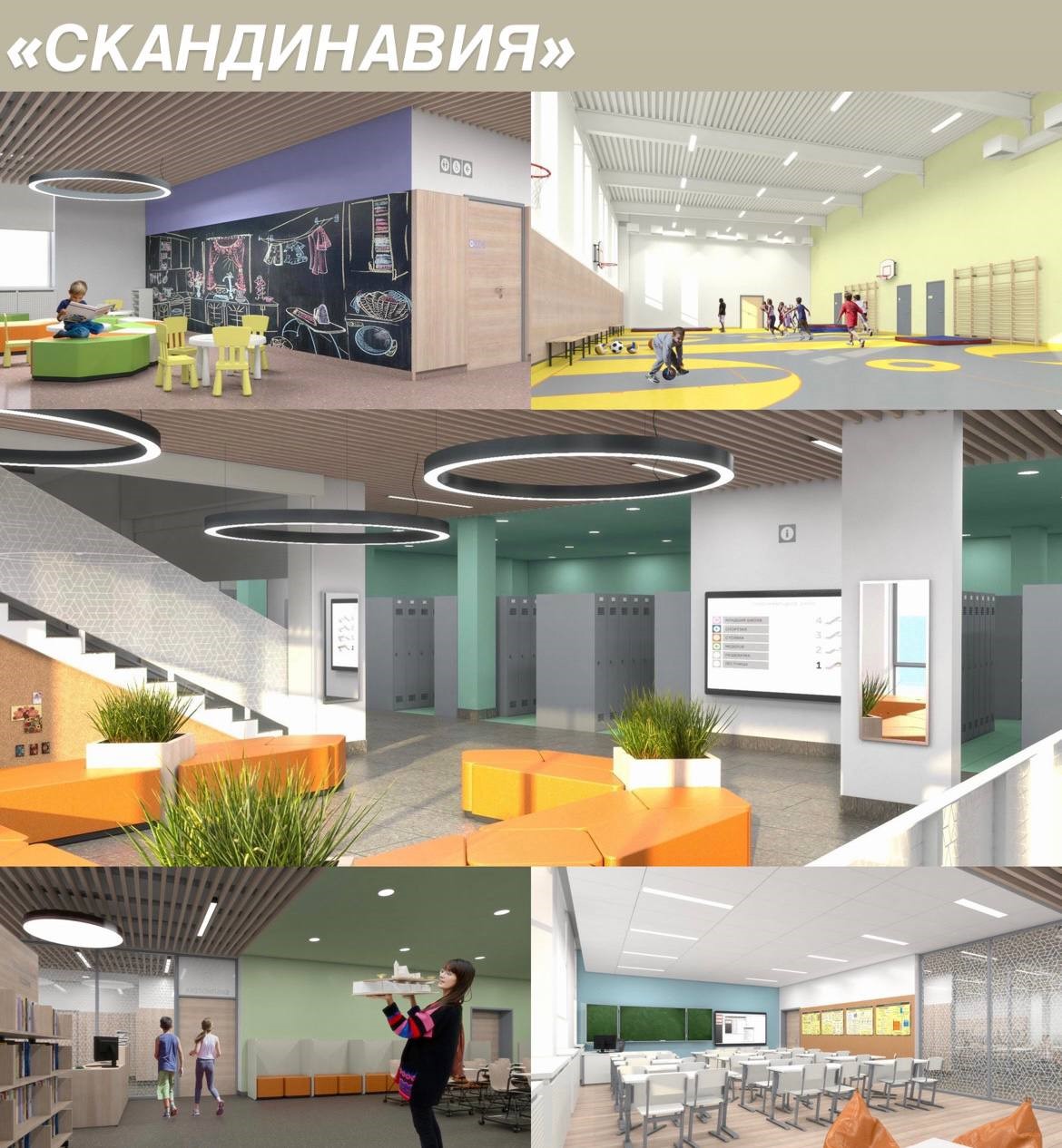 За основу первой концепции «Скандинавия» был взят современный стиль, где много света и натуральных материалов. Основной цвет - белый с добавлением пастельных тонов, согласно цветовому зонированию. В проекте используются витражные перегородки, современная, лаконичная и функциональная мебель, преимущественно белого, светло-серого цвета или цвета дерева – вяз светлый. В рекреациях акцент сделан на яркие цвета мягкой мебели. Разработана интуитивно понятная детям и взрослым система навигации, без перенасыщения текстом, что позволяет не загружать информационными элементами плоскости стен и дверей.