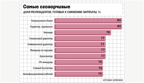Портал Superjob.ru выяснил, насколько сотрудники согласны снизить зарплатные ожидания при устройстве на работу. Было опрошено 3800 респондентов 38 профессий, по 100 на каждую. Среди наиболее неуступчивых выделяются представители социальной сферы. Только треть врачей и медсестер готов к снижению зарплаты, а учителя согласны лишь на снижение в 8,2%.