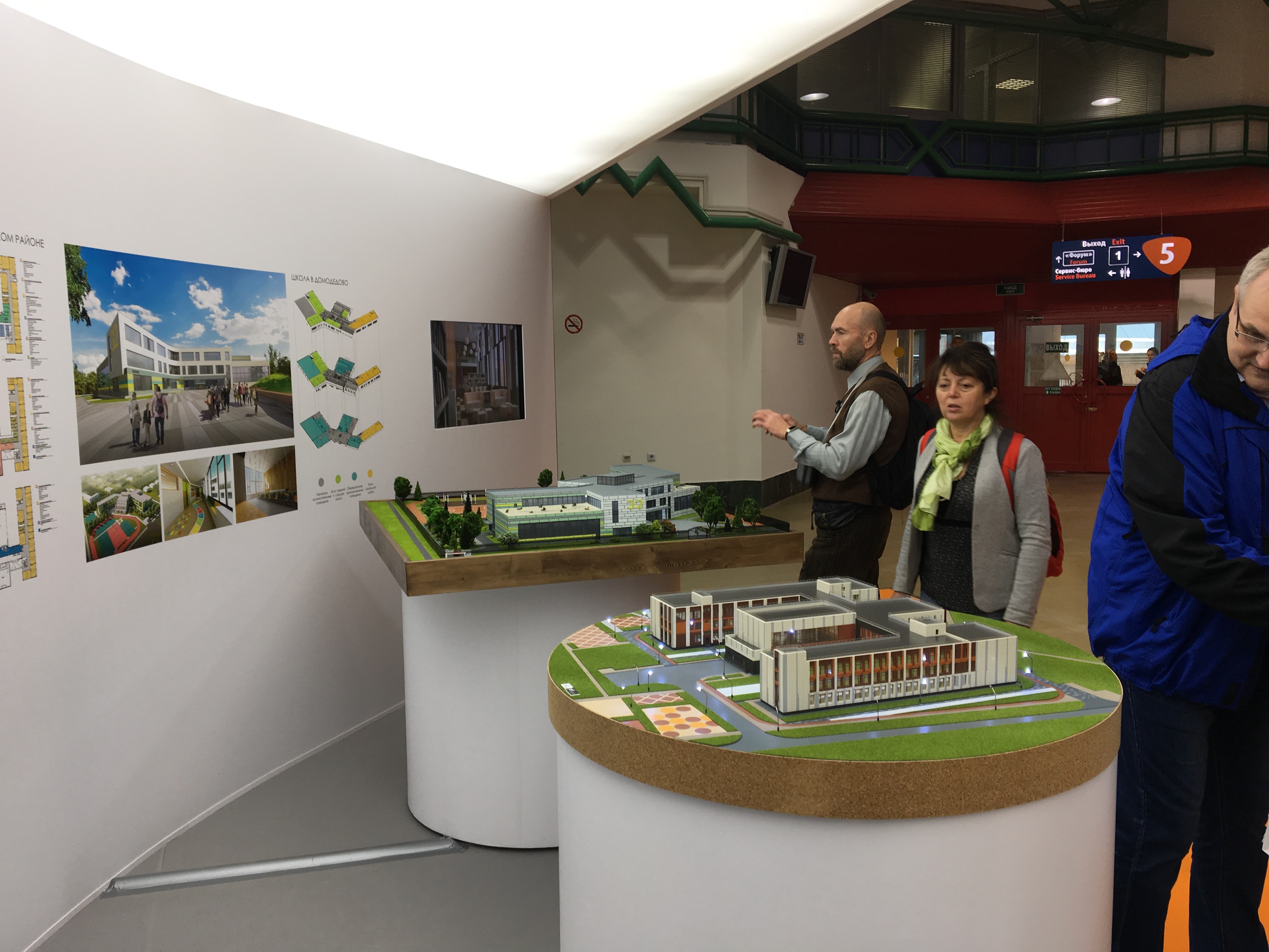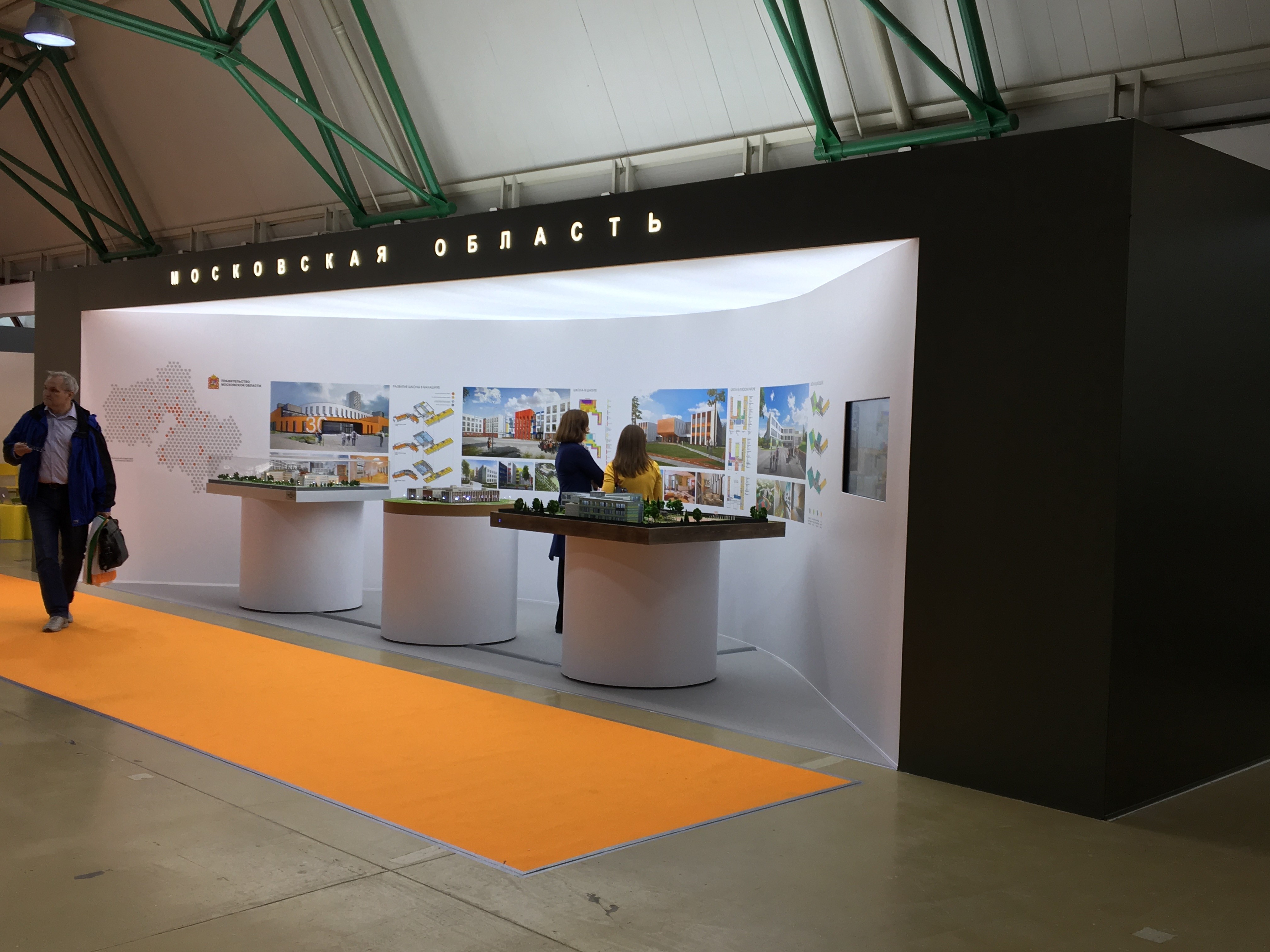 На стенде проекты четырёх: школ: в Шатуре (НИИПИ градостроительства МО), в Балашихе ( Академпроект и Архитектурное бюро Асадова), Домодедово ( НИИПРОЕКТ) и в Рузском районе (АРС-СТ), макеты и графика. Экспозицию подготовила Главархитектура Московской области совместно с Ассоциацией проектировщиков Московской области, кураторы - архитекторы Андрей и Никита Асадовы.