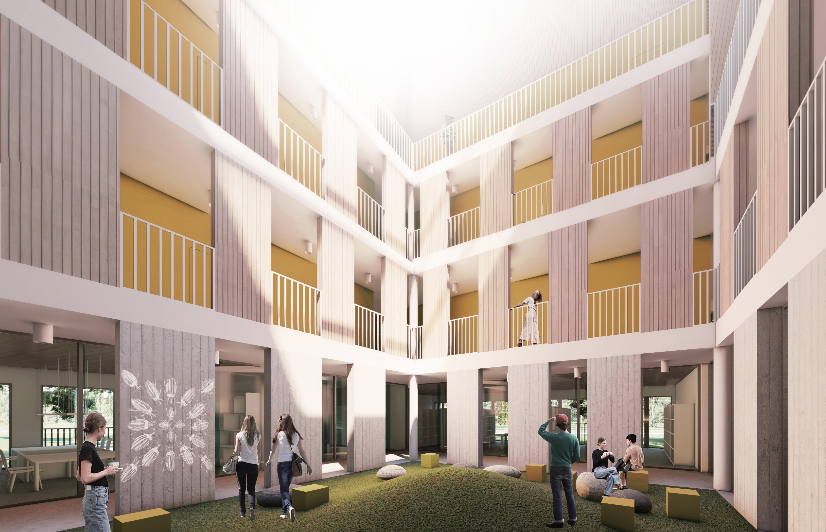 Комплекс общежитий состоит из круглого трехэтажного корпуса для проживания преподавателей в южной части участка и четырех отдельно стоящих блоков для учащихся – в северной. Планировочным ядром в них станут светлые и просторные атриумы – рекреации, в которые будут выходить коридоры 2 и 3 этажей.