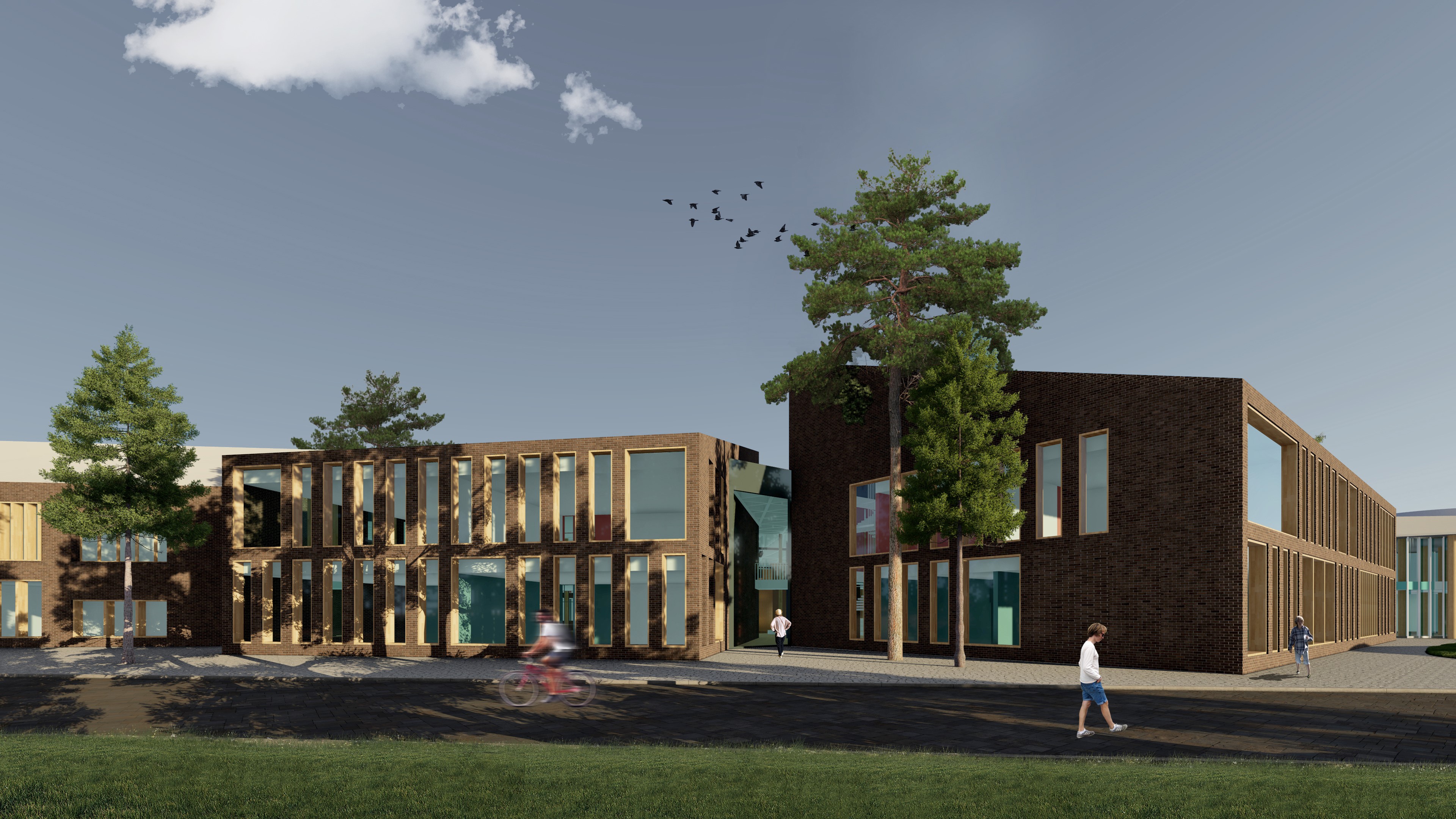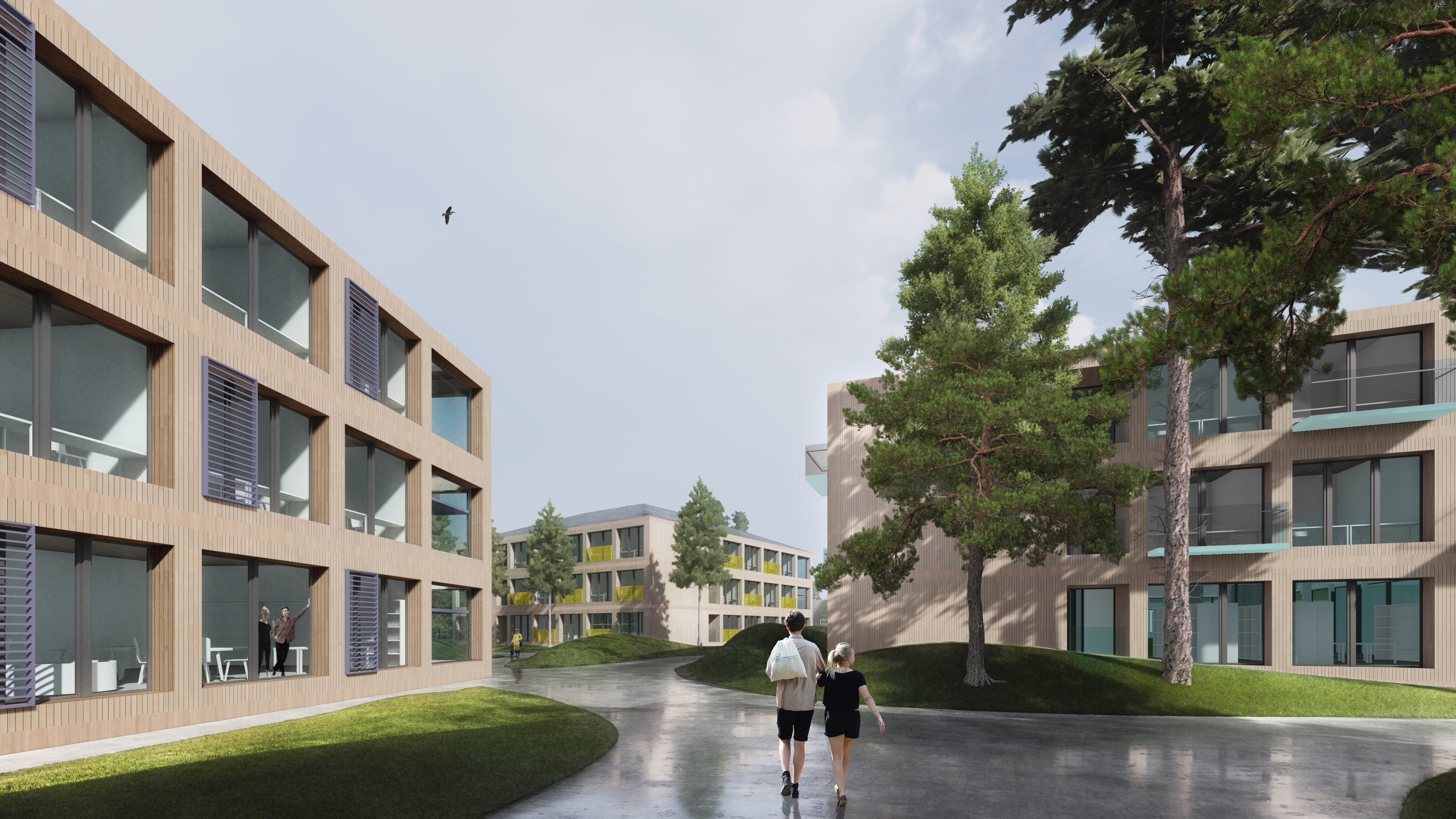 Архитектура невысоких построек органично вписана в ландшафт и отличается «скандинавским» минимализмом, при котором ведущую роль играют выверенные пропорции. Фасады учебного корпуса, получившегося пластичным и достаточно сложным по своей композиции, сдержанные – облицовка предполагается из светлого кирпича