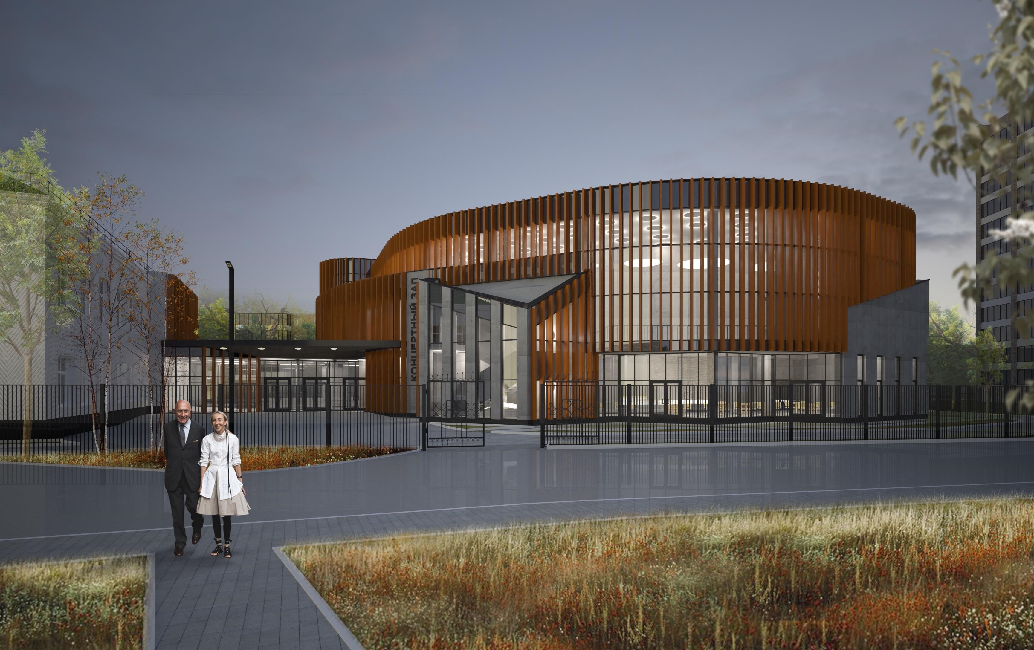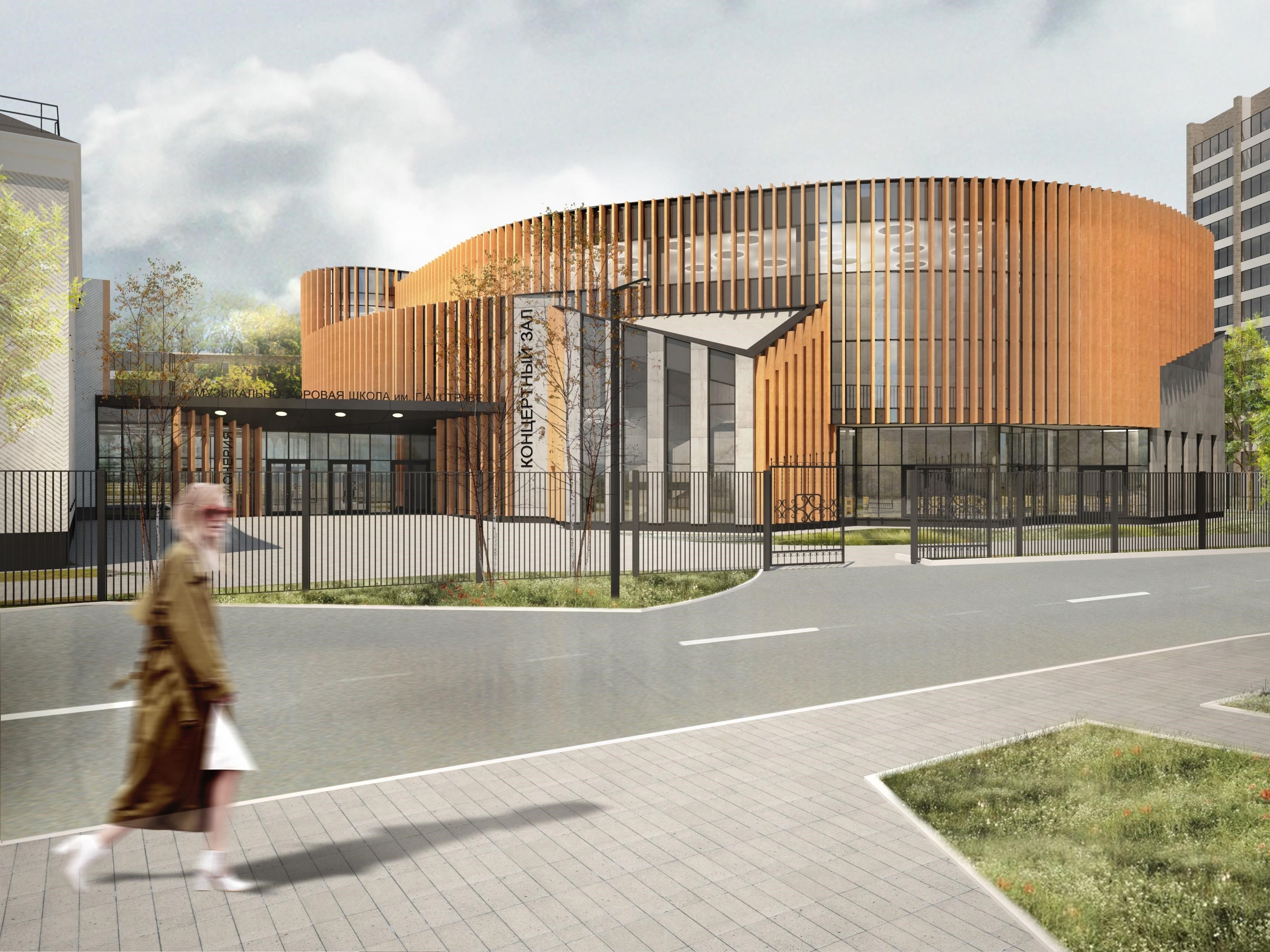 Согласно концепции, трехэтажная пристройка спроектирована в форме скругленной капли, повторяющей границы проектируемого участка. С существующей школой зал связан новым остекленным вестибюлем, который перетекает в просторное фойе-рекреацию, со зрительским буфетом и летней террасой. Зоны фойе объединены атриумами и открытыми лестницами. Весь первый этаж общественной части будет иметь сплошное остекление.