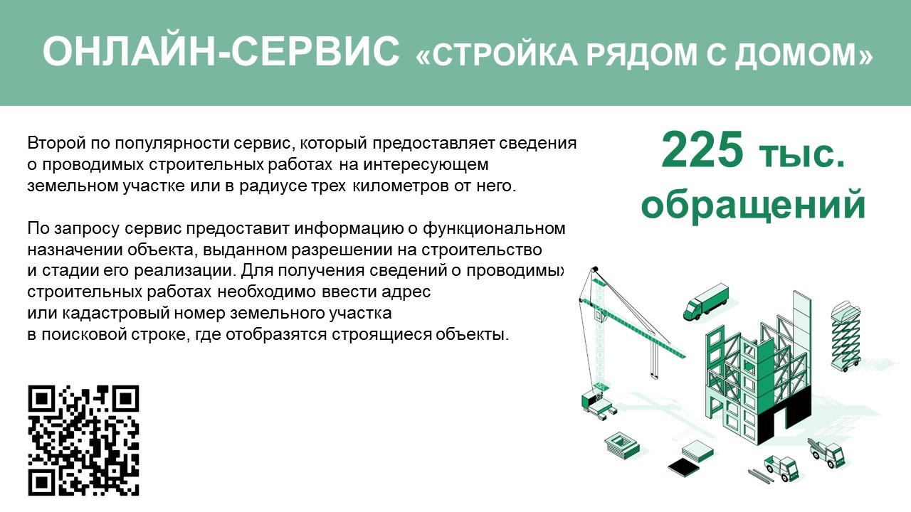 Второй сервис по популярности – «Стройка рядом с домом» – 225 тысяч запросов. Он позволяет узнать о проводимых строительных работах на интересующем земельном участке или в радиусе 3 км от него. По запросу сервис предоставит информацию о функциональном назначении объекта, выданном разрешении на строительство и стадии его реализации.