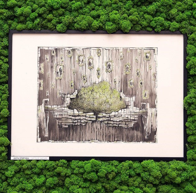 « Идея выставки родилась у меня в Германии, где я увидел работы из натуральных материалов очень талантливых и влюбленных в Россию людей. Мой проект оказался интересен и близок Алексею и нам за короткий срок удалось его реализовать», - рассказал Дмитрий Климов. Алексей Полищук так же выступил в этом проекте в качестве художника , выполнив серию из 10 графических работ. Особенность экспозиции состоит в том , что рисунки обрамлены декоративной текстурой из натурального стабилизированного мха, усиливающей художественный эффект. В центре выставочного пространства расположена тематическая ландшафтная композиция из камней и растений, созданная партнером мероприятия – мастерской Юлии Наместниковой.