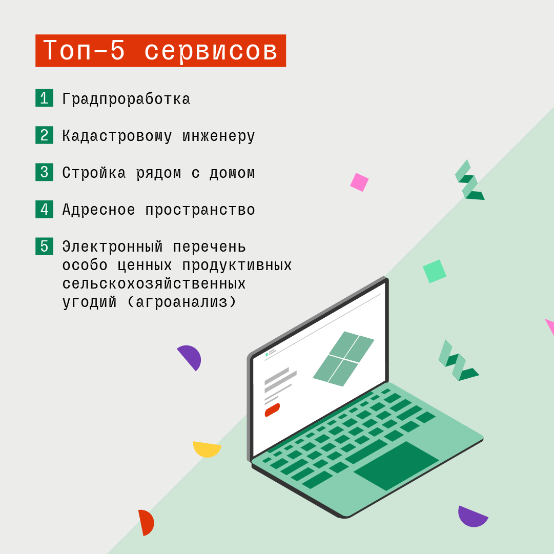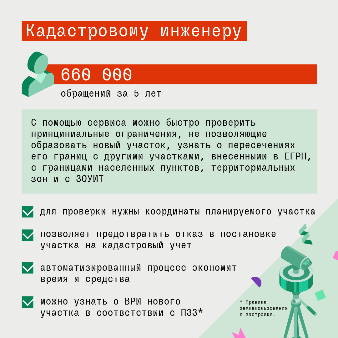 На втором месте по популярности – сервис для специалистов отрасли - «Кадастровому инженеру», который начал функционировать в 2020 году. На сегодняшний день к ресурсу обратились более 660 тысяч раз. С помощью онлайн-сервиса можно оперативно проверить принципиальные градограничения, не позволяющие образовать новый земельный участок. Имея координаты планируемого участка, можно получить информацию о пересечениях его границ с другими земельными участками, внесенными в ЕГРН, границами населенных пунктов и территориальных зон, зонами с особыми условиями использования территории. Ресурс позволяет ощутимо сократить время и трудозатраты при работе над формированием земельных участков, снизить расходы на доработку схем расположения земельных участков и минимизировать количество отказов по госуслугам в этой сфере.