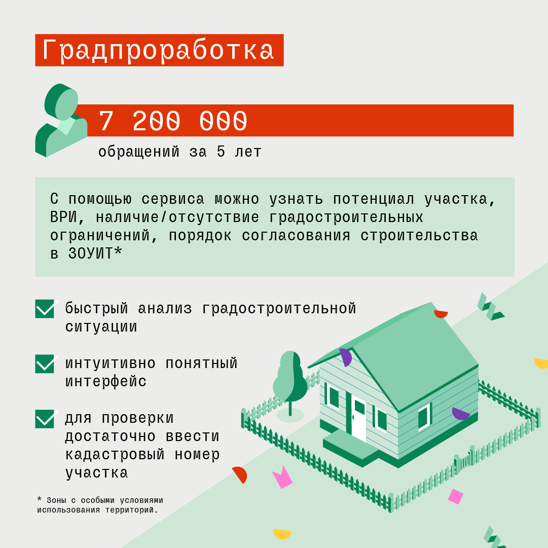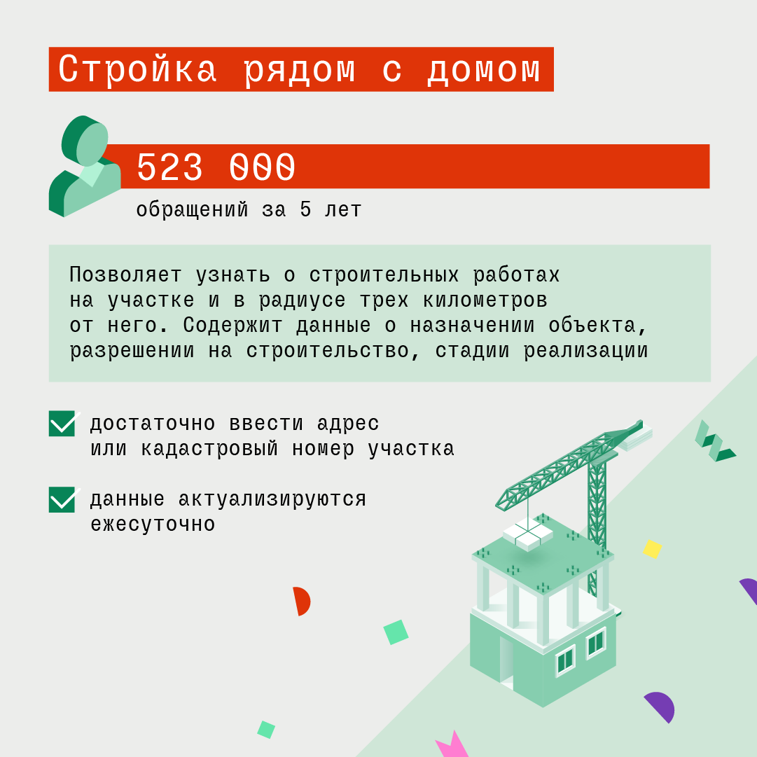 На третьей позиции – кейс «Стройка рядом с домом» – 523 тысячи визитов. С помощью сервиса можно узнать о проводимых строительных работах на интересующем земельном участке или в радиусе 3 километров от него. По запросу жителя сервис предоставит информацию о функциональном назначении объекта, выданном разрешении на строительство и стадии его реализации.