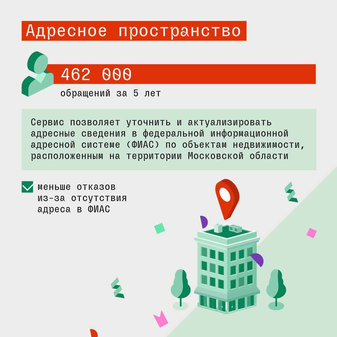Следующий по востребованности – сервис «Адресное пространство», позволяющий уточнить и актуализировать адресные сведения в федеральной информационной адресной системе по объектам недвижимости, расположенным на территории Московской области. Им воспользовались 462 тысячи раз.