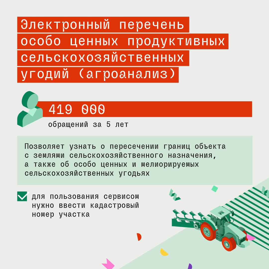 И замыкает пятерку популярнейших градостроительных сервисов – «Электронный перечень особо ценных продуктивных сельскохозяйственных угодий». К сервису обращаются жители Московской области и представители бизнеса, чтобы узнать о пересечениях земельного участка с землями сельскохозяйственного назначения, а также актуальных сведениях об особо ценных и мелиорируемых сельскохозяйственных угодьях. За все время работы к нему обратились 419 тысяч раз.