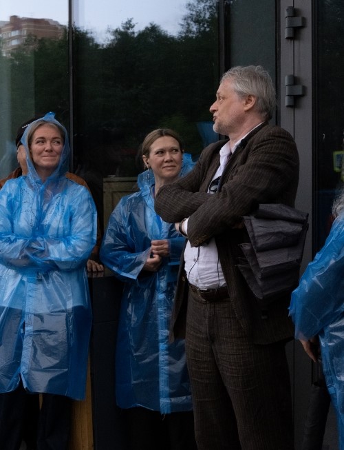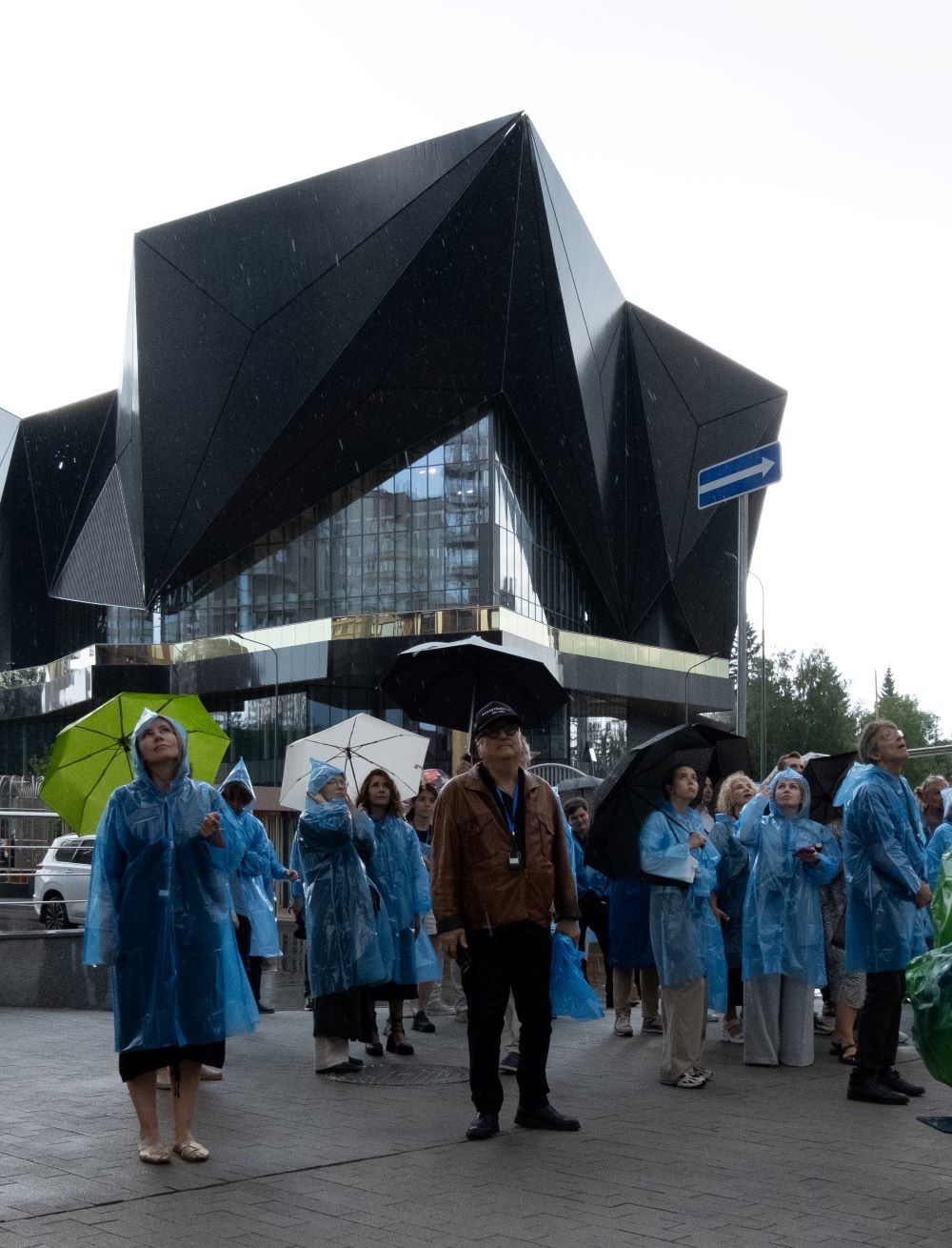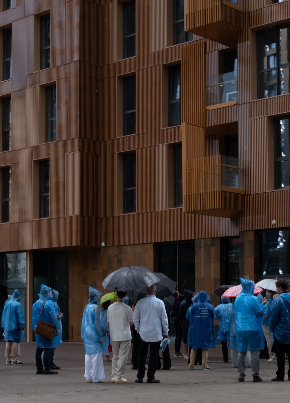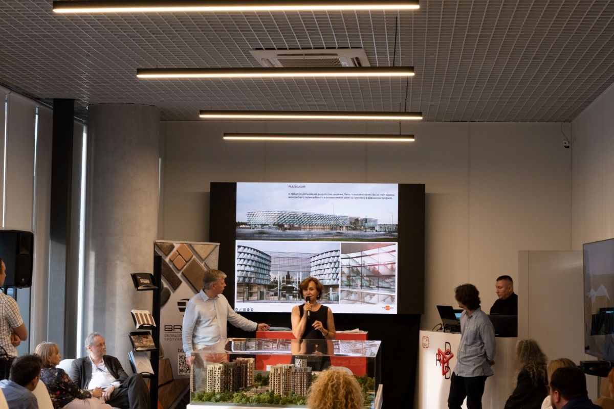 Обойдя комплекс под рассказы автора проекта об особенностях работы над проектом и сложностях реализации, которые были успешно преодолены по ходу строительства, успев обсохнуть на солнце, выглянувшем после ливня, архитекторы смогли задать Станиславу Кулишу вопросы, послушали выступления компаний "Алкотек", BRAER, Glass Wall, архитектора Дмитрия Пшеничникова (бюро Пшеничникова), рассказавшего о концепции крупного спортивного центра в западной части Крыма, и представителей бюро "Мезонпроект" Илью Машкова и Петра Топчиева, познакомивших коллег с путями поиска архитектурных решений реализующегося в настоящее время Многофункционального центра на подмосковном Новорижском шоссе. После всего гости долго и по-дружески общались, не торопясь расставаться.