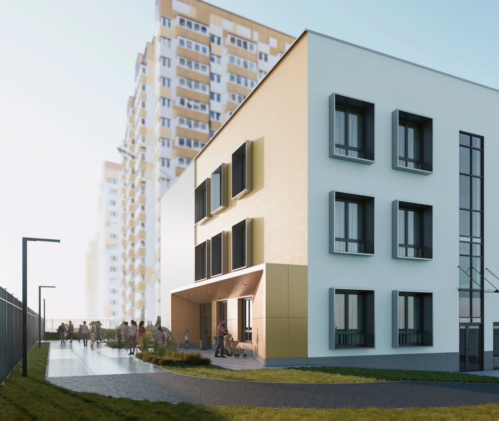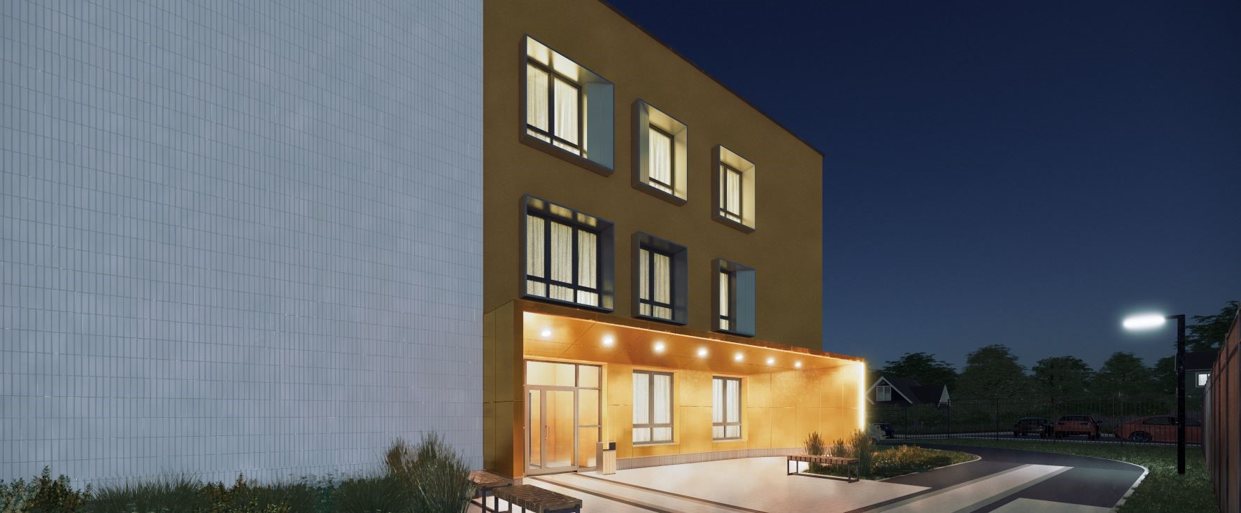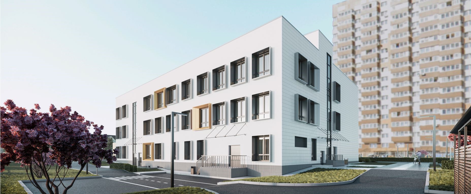 По проекту облик учреждения выполнен в стиле минимализм. Акцентным элементом экстерьера станет выступающая на 1,6 метра из основного объема здания входная группа, которую украсят алюминиевыми панелями желтого цвета и вечерней подсветкой. Внешние откосы и отливы окон так же выполнят из металлических панелей и выделят серым и желтыми цветами, благодаря чему фасады приобретут рельефность, дополнительный объем и визуальную целостность.