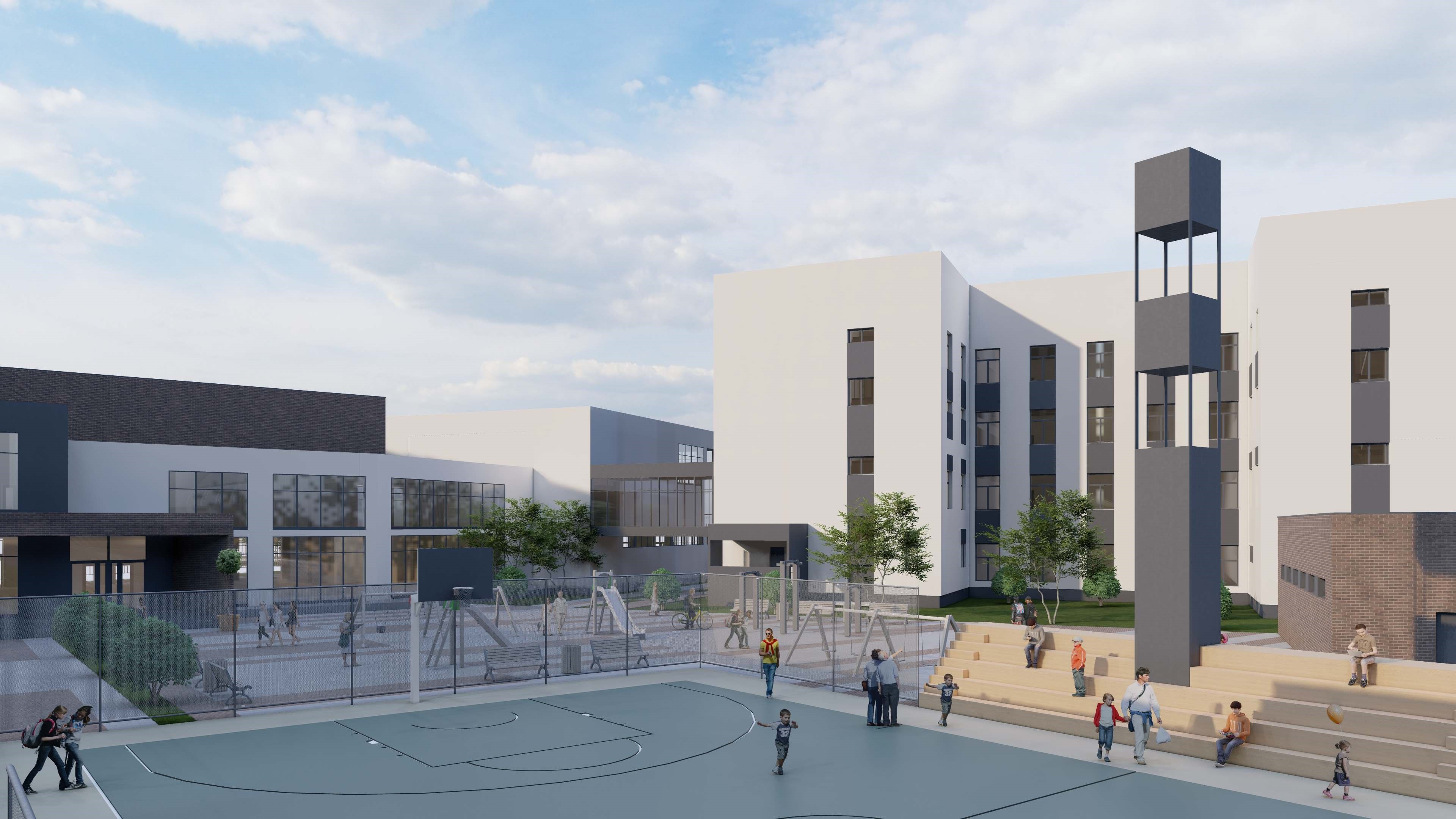 На прилегающей территории будет выполнено комплексное благоустройство с озеленением. Для учащихся появятся площадки с игровыми и спортивными комплексами для разных возрастных групп, поле для игры в мини-футбол, волейбол и баскетбол.