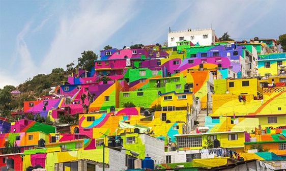 До обновления квартал состоял из обычных трущоб, которые художники сначала полностью закрасили белой краской, а затем разрисовали яркими абстракциями. Всего они потрудились над 209 зданиями, плоскость раскрашенных стен которых суммарно составила более 20 тыс. кв. м. Это заняло у команды под руководством стрит-арт-художника Mibe из Мехико 2,5 месяца работы. Особенно эффектно «полотно» смотрится издалека – стены спускающихся зданий создают единую плоскость, занятую огромной абстракцией.